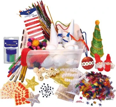 enthält Kleber, Streuglitzer, Sticker Goldsterne und Silbersterne, Sticker Weihnachtsmann und Herzen, Weihnachtspailletten, Holzkugeln, Augen, Pompom Bälle, Haar & Bart, Chenille-Draht, Satinband mit Weihnachtsmotiven, Glitzerklebestifte, Satinband rot, Styropor-Kegel, Styropor-Kugeln, Styropor-Sterne, Styropor-Herzen, Strickschlauch rot