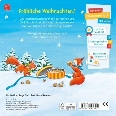 – Weihnachtlicher Vorlesespaß für Kinder ab 2 Jahren- Magische Schieber erwecken die Tiere zum Leben- Lustige Reime animieren zum MitsprechenFröhliche Weihnachten! Das Häschen rutscht über den gefrorenen See. Die Eule schmückt die Tanne mit roten Kugeln. Und wer hat von den Plätzchen genascht?Bewege den Wackelschieber und freue dich mit den Tieren auf Weihnachten!Lustige Reime und ein spannender Bewegungseffekt, den schon kleine Kinderhände auslösen können, machen Spaß und verkürzen die Wartezeit auf Weihnachten.Bald ist Weihnachten. Doch es gibt noch viel zu tun: Gemeinsam schmücken die Tiere im Wald den Weihnachtsbaum, packen Geschenke ein und hängen bunte Lichterketten auf. Den Dachsen bleibt aber auch Zeit für ein Spiel im Schnee, die Mäuschen rutschen vergnügt den Hang hinunter und die Häschen schlittern fröhlich mit Schlittschuhen übers Eis. Hoppla, wer macht da eine Bauchlandung?Dieses Buch ist magisch: Schon kleine Kinderhände bewegen den Schieber am Seitenrand mühelos. So werden gleich zwei Tiere im Bild lebendig. Sie huschen hin und her oder hüpfen auf und ab. Ein faszinierendes Spielbuch für Kinder ab 2 Jahren!Penners, BerndBernd Penners wurde 1958 im Selfkant (nahe der niederländischen Grenze) geboren. Er ist verheiratet, Vater von zwei Töchtern und arbeitet als Grundschullehrer an einer Schule in Aachen. Mit seinen Büchern möchte er Kinder zum Schmunzeln bringen und zeigen, dass das Leben die unterschiedlichsten (Buch)Seiten hat…Flad, AntjeAntje Flad wurde 1966 in Merseburg geboren und ging dort zur Schule. Anschließend studierte sie an der Hochschule für Kunst und Design Burg Giebichenstein in Halle das Fach Spielzeugdesign und arbeitete nach ihrem Diplomabschluss als Designerin für verschiedene Spielzeugunternehmen. Seit 1998 ist sie auch als Illustratorin freiberuflich tätig. Sie zeichnet hauptsächlich für Kinderbuch- und Spieleverlage und arbeitet sowohl mit analogen als auch mit digitalen Maltechniken. Heute lebt sie gemeinsam mit ihrer Familie in Berlin.